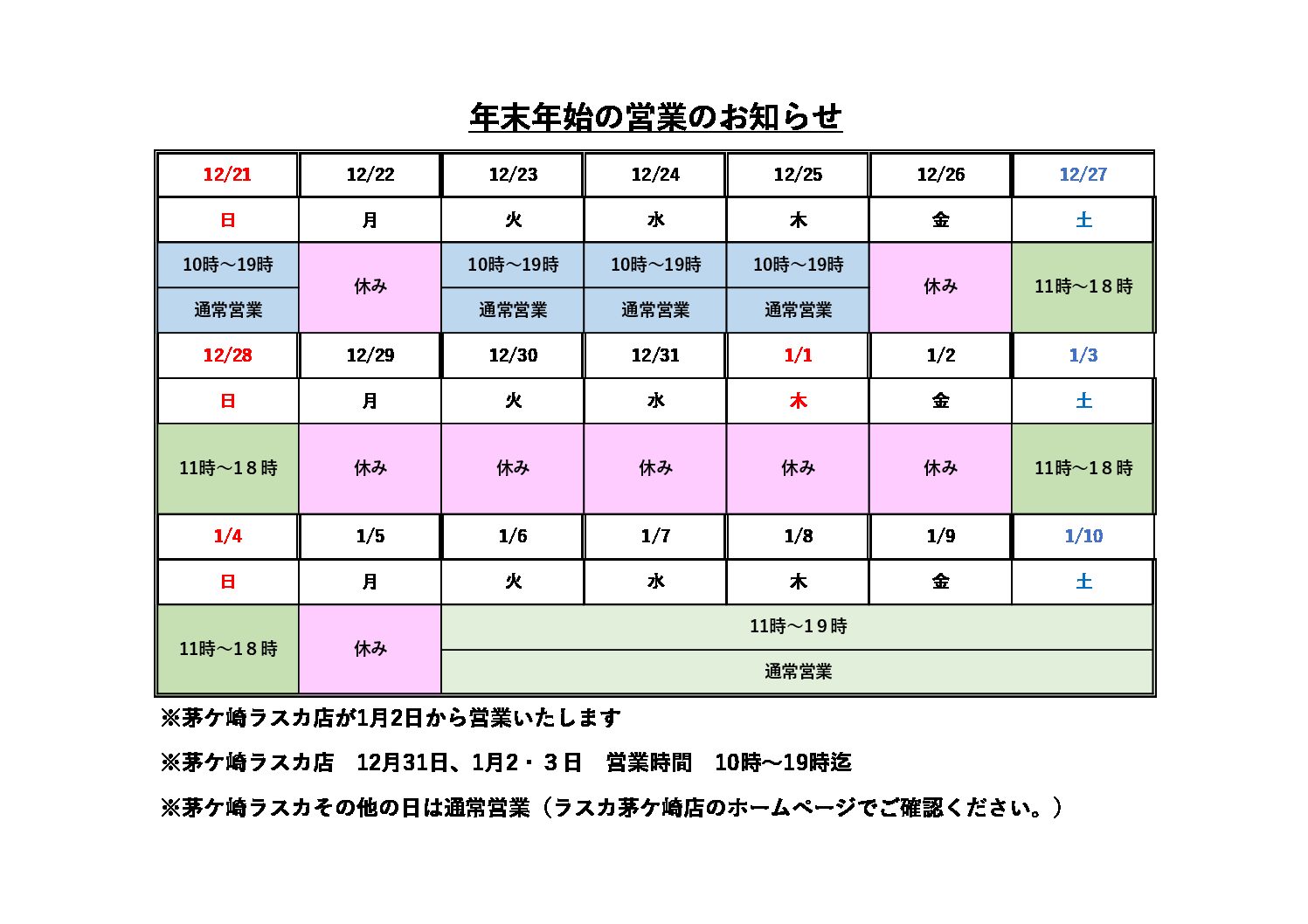 尚、ラスカ店は1月1日以外は営業しております。